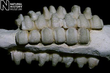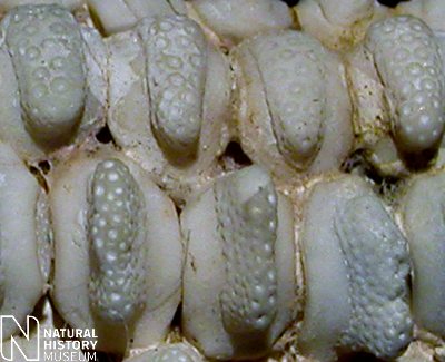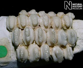 2). Detail of the above specimen; each ossicle possesses a central ridge ornamented with crater-like pits, some of which are rimmed (x8.0). Image © 2005 The Natural History Museum, by kind permission.