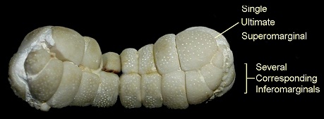 2). Side profiles (x3); (A) Crateraster quinqueloba, an even number of superomarginals and inferomarginals; (B) Metopaster parkinsoni, an enlarged ultimate superomarginal with several corresponding inferomarginals.