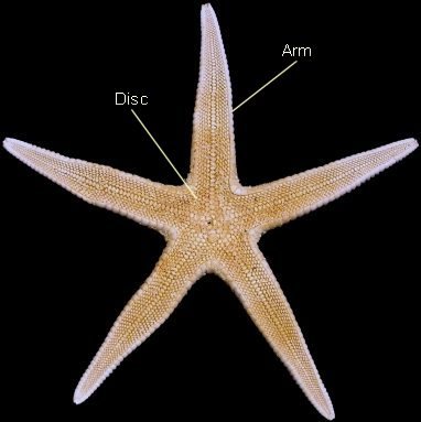Arms (typically 5) extend radially from the central body of the animal; the disc. On the oral surface rows of tube-feet, extensions of the water-vascular-system, protrude from the ambulacra, and are used for locomotion and feeding. Adambulacral ossicles run alongside the ambulacra.