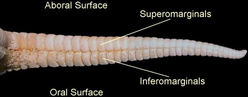 3). Lateral (side) view of an arm (x3). Typically there are 2 rows of marginals; the superomarginals on the aboral surface and the inferomarginals on the oral surface.