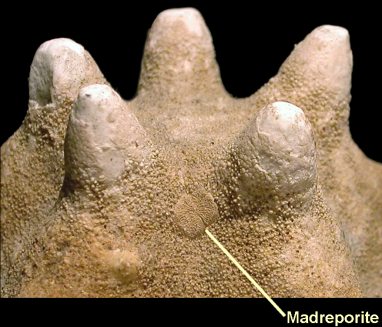 4). Robust modern starfish (Protoreaster sp., Oreasteridae), comparable to the Chalk Stauranderasteridae (which may in fact belong with the Oreasteridae); (A) Aboral surface, with a crown of enlarged radials (x1.3); (B) Detail showing the position of the madreporite nestled between the radials (x3.0).