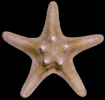 1). (A) Aboral (upper) and (B) oral (under) surfaces of a modern Asteroid (x1.3, Archaster sp., Archasteridae), comparable in general morphology to the Chalk Goniasteridae and Pycinasteridae. The complex asteroid skeleton is composed of many thousand small calcareous ossicles.