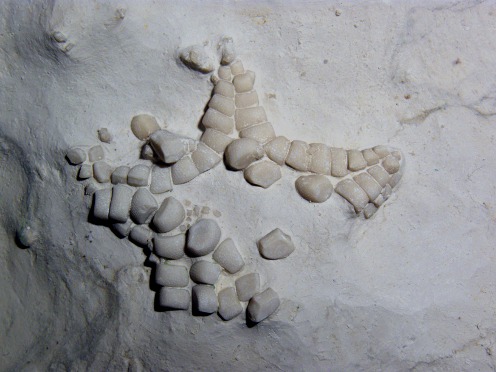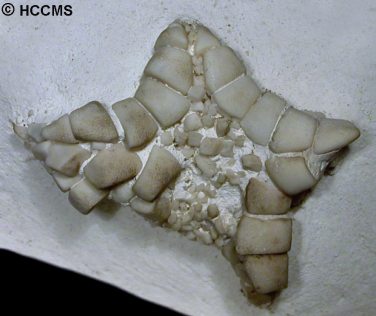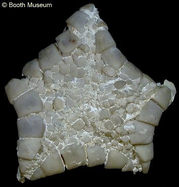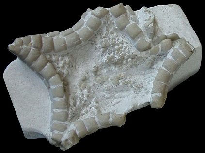 A very common chalk starfish, ranging throughout the chalk. The marginal ossicles are slightly cubic, with a gently pitted outer surface. Individuals are typically small, with a robust marginal frame and weakly developed arms. Metopaster is superficially quite similar, but has a bordered ossicle-ornamentation and an expanded ultimate superomarginal (distinguish Metopaster and Crateraster).