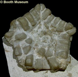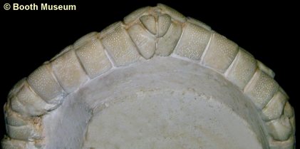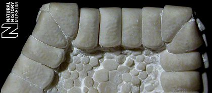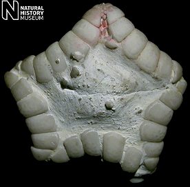 6). Detail of an exceptionally preserved oral surface, with well articulated mouth angle plates; x9.0, Seaford Chalk, Micheldever, Hampshire, Blackmore Collection, BMNH (British Museum (Natural History) London) E20271. Image © 2005 The Natural History Museum, by kind permission.