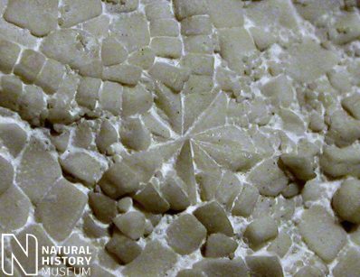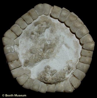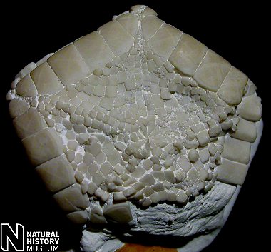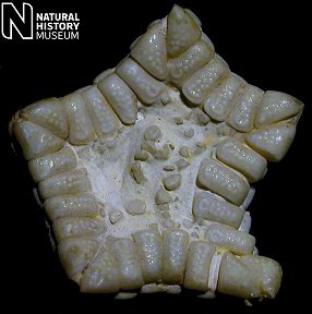 2). Oral surface of an exquisitely preserved specimen, note that the inferomarginal ossicles are virtually smooth except for the recessed border; x3.1, Seaford Chalk, Micheldever, Hampshire, Blackmore Collection, BMNH (British Museum (Natural History) London) E20271. Image © 2005 The Natural History Museum, by kind permission.