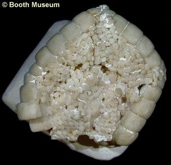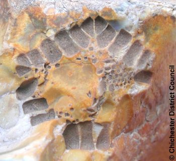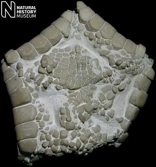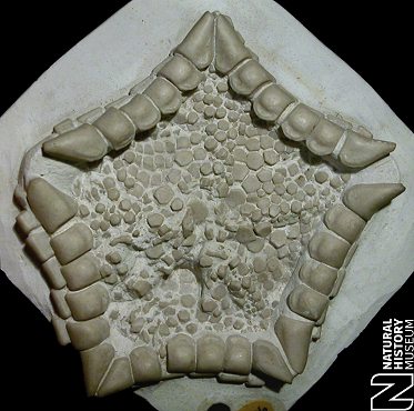 4). (A) Aboral view of a large and very well preserved individual (x1.6, White Chalk, Willett collection, Booth Museum, BMB 007823, by kind permission of John Cooper); (B) Detail of the oral surface, retaining the mouth angle plates in near perfect articulation (x4.8, BMNH (British Museum (Natural History) London) 46772. Image B © 2005 The Natural History Museum, by kind permission.