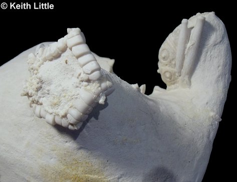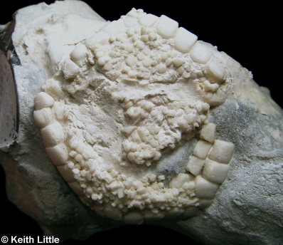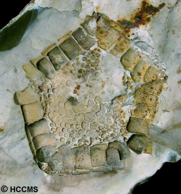 5). A well preserved specimen, partially encased in flint (Seaford Chalk, Thanet Coast, Kent, in the collection of Keith Little).; (A) General view of the oral surface (x1.8): (B) Lateral (side) view of arm tip - note the expanded ultimate superomarginal and the several corresponding inferomarginals (x5.0). Images © 2010 Keith Little, by kind permission.