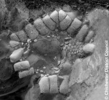 9). Details of the oral surface (inferomarginals); (A) This individual has virtually smooth inferomarginals (x2, White Chalk, 'Brighton', Willett collection, Booth Museum, BMB 007828, by kind permission of John Cooper); (B) These inferomarginals have a weakly developed recessed-border (x.3.6, Alton area (Hampshire)?, White Chalk, HCCMS (Hampshire County Council Museum's Service) collection, stored at Gosport Museum, G.1983.426, by kind permission of Dave Kemp, HCCMS).