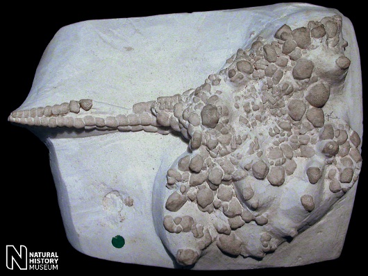 5). Stauranderaster boysii - general view of a partial specimen displaying jumbled central disc and crown ossicles, and a single well articulted arm (x1.4, White Chalk, Bromley, Kent, Simmons Collection, BMNH (British Museum (Natural History) London) 46600). Image © 2012 The Natural History Museum, by kind permission.