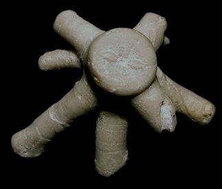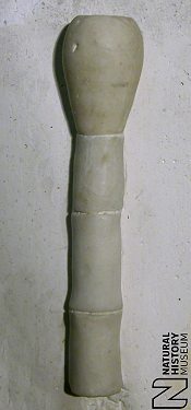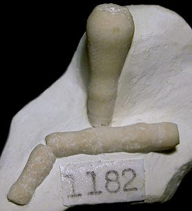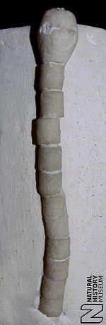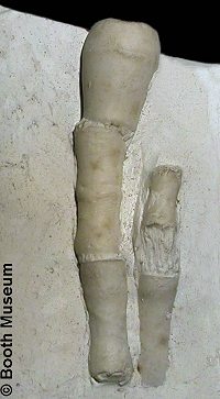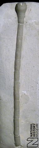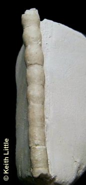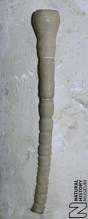 These distinctive, worm-like crinoids occur throughout the White Chalk. The elements of the calyx are fused into a simple swollen form which merges into the stem, whilst the columnals appear as short rods with a parallel-sided or rounded dumb-bell profile. The calyx and columnals occur with great frequency as isolated skeletal elements. However, articulated material is very scarce and the arms are essentially never retained. The branching root-network (radix) is occasionally found, but not in association with the rest of the animal. A number of species are recognised, based largely on subtle features such as the profile of the calyx and the arrangement of its plates.