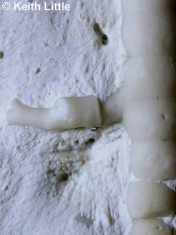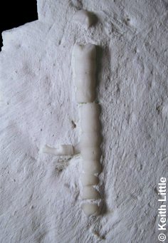 6). Bourgueticrinus cf. ellipticus, partial articulated individual with lateral branch (accessory root?) (Newhaven Chalk, Palm Bay, Thanet Coast, Kent, in the collection of Keith Little): (A) General view of specimen (x1.9); (B) Detail of branch from main stem (x5.0). Images © 2010 Keith Little, by kind permission.