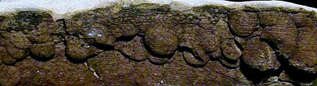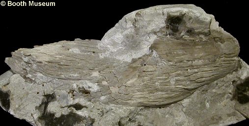 2). Broken surface of the above specimen, displaying the petrified internal grain of the wood and flint-filled borings of the worm-like bivalve Teredo (x0.8, flint (White Chalk), from drift material, Nickleham, Surrey, Willett Collection, Booth Museum, BMB 008196, by kind permission of John Cooper).
