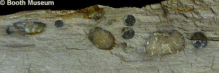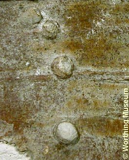 4). Mouldic preservation of heavily Teredo-bored wood; (A) x2.2, Grey Chalk, Glynde, East Sussex, Randell Collection, RR 1061; (B) x2.9, 'Brighton', Willett Collection, Booth Museum, BMB 008203, by kind permission of John Cooper.