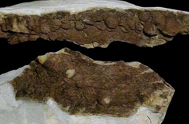 5). Mouldic preservation of a large piece of wood with Teredo borings (Sussex (?), Worthing Museum, Martin Collection, by kind permission of Worthing Borough Council); (A) General view (x0.7); (B) Detail of the Teredo borings (x2.6).