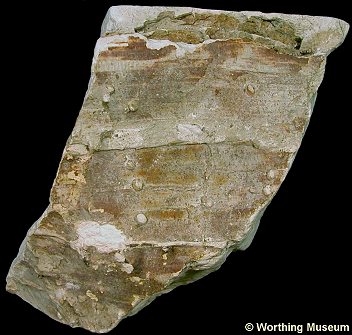 6). A petrified piece of wood enclosed within flint; the pale nature of this specimen presumably stems from prolonged exposure as drift (x1.2, flint (White Chalk), Willett Collection, Booth Museum, BMB 008198, by kind permission of John Cooper).
