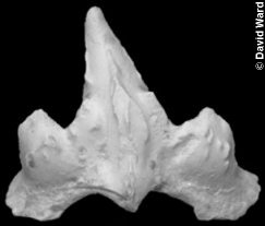 2). Cederstroemia sp.? - Labial views of isolated laterals of a form with a Squatina-like morphology, with a central 'pendant' of enamaloid hanging over the root and no accessory cusps: (A) x12, Willett Collection, Booth Museum, BMB 011239, by kind permission of John Cooper); (B) x9.5, Willett Collection, Booth Museum, BMB 007321, by kind permission of John Cooper).