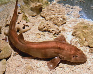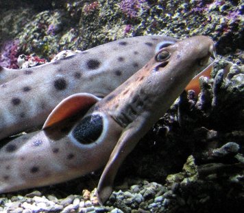 6). Modern Orectolobids for illustration - Hemiscyllids (Longtail Carpet Sharks / bamboo Sharks): (A) Brownbanded Bamboo Shark (Chiloscyllium punctatum); (B) Epaulette Shark (Hemiscyllium ocellatum). (images sourced from Wikipedia).