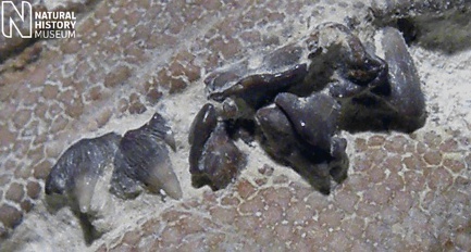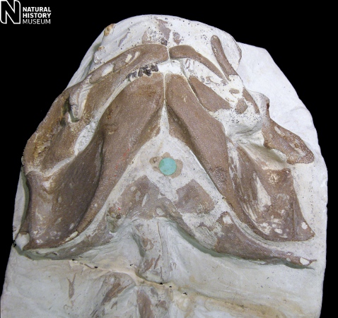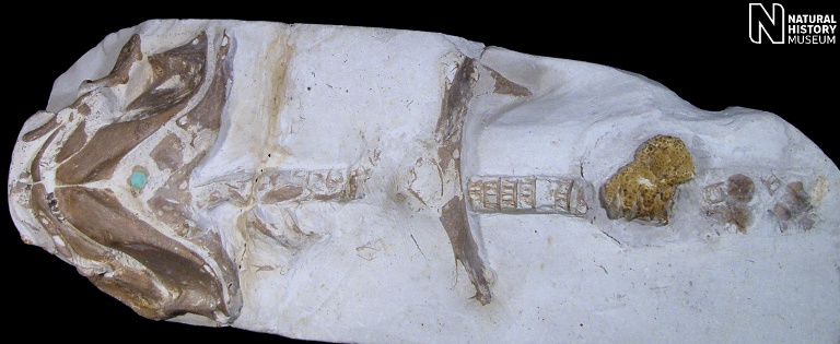 3). Cantioscyllium decipiens - Ventral (underside) overview of the completely unique type specimen, with a near complete set of calcified originally-cartilaginous skeletal elements of the head (mandibular and hyoid arches) and anterior portion of the trunk. The pectoral arch straddles the vertebral column on the right of the figure (x0.85, Grey Chalk, Blue Bell Hill, Burham, Kent, NHMUK (British Museum (Natural History) London) PV P.5890). Image © 2012 The Natural History Museum, by kind permission.