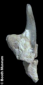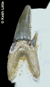 2). Leptostyrax / Protolamna sp., Lingual surfaces of a pair of small associated teeth (x5.3, Booth Museum, by kind permission of John Cooper).