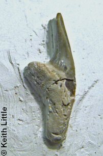 The extinct Eoptolamnids are the most ancient recognised Lamniforms, entering the fossil record in the Barremian. They possess medium to small tearing teeth, isolated examples of which are occasionally encountered in the Chalk. Characteristics of the teeth include a tall, slender main cusp with a convex lingual surface, sided by a pair of narrow accessory cusps. The lower part of the cusps is often ornamented with medium to fine ridges. Root halves are narrow and pronounced, with a narrow and deeply incised basal notch. There is a highly pronounced lingual protrusion.