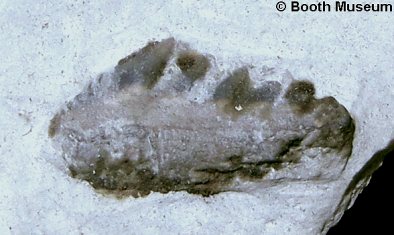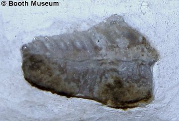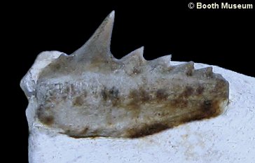 3). Notorhynchus sp.? - Seemingly associated teeth: (A) Lingual view of a tooth; (B) Labial view of a tooth; (x7.5, Grey Chalk, Glynde, near Lewes, East Sussex, Willett Collection, Booth Museum, BMB 007325, by kind permission of John Cooper).