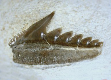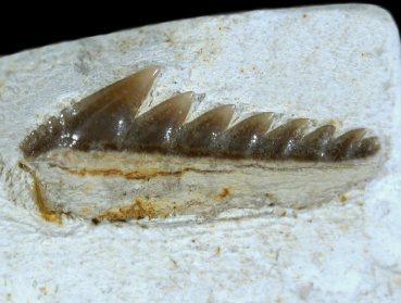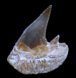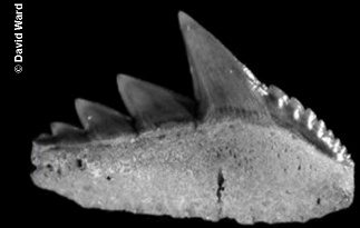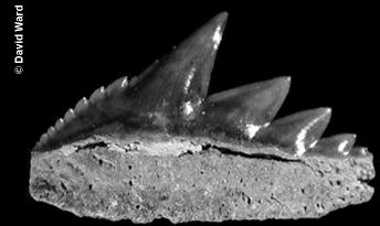 5). Notorhynchus aptiensis - (A) Labial and (B) lingual views of a representative isolated Notorhynchus tooth from the Albian Gault Clay of Folkestone (x7.5). Images (A, B) by kind permission of David Ward. See also www.gaultammonite.co.uk [Fossils of the Gault Clay].