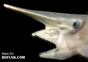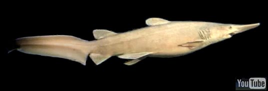 4). Mitsukurina owstoni, the extant Goblin shark - rare imagery of live individuals: (A) General view (view footage on You Tube); (B) Close up of the head with jaws extended to seize prey (view footage on You Tube) Images are still frames from footage on You Tube.