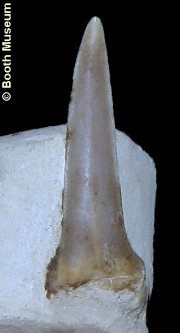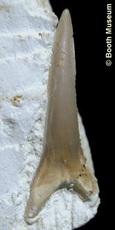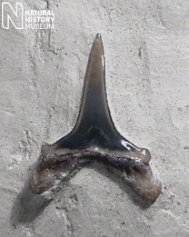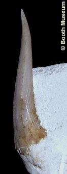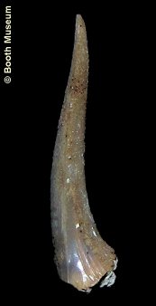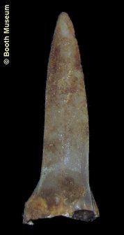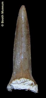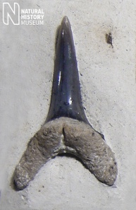 2). Scapanorhynchus raphiodon - (A) Labial, (B) side and (C) lingual views of an anterior tooth lacking root. Note the smooth labial surface and the characteristic fine striations on the lingual surface (x4.8, Booth Museum, by kind permission of John Cooper).