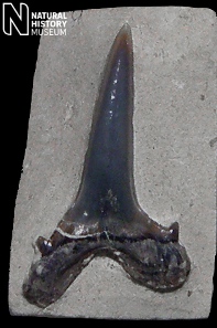 1). (A) Anomotodon sp. - Labial view of an anterior tooth (x3.7, Booth Museum, BMB 024342, by kind permission of John Cooper); (B, C) Scapanorhynchus raphiodon - (A) Labial and (B) side views of an anterior tooth lacking root. Note the smooth labial surface and the characteristic fine striations on the lingual surface (x4.4, 'Middle' Chalk, Lewes, Willett Collection, Booth Museum, BMB 007314, by kind permission of John Cooper).