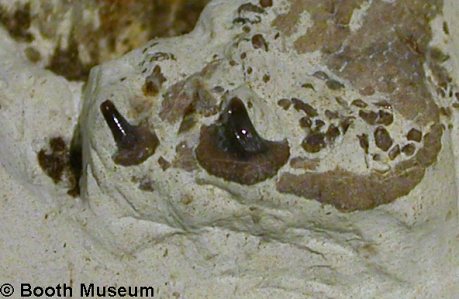 2). Squatina cranei; Detail of the type specimen showing dermal denticles resting against a calcified formerly cartilaginous skeletal element from the back of the head (x9).