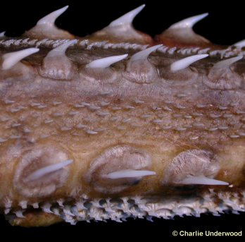3). Thorny placoid scales on the tail of a modern Rajid (skate) (x4). Image courtesy of Charlie Underwood.