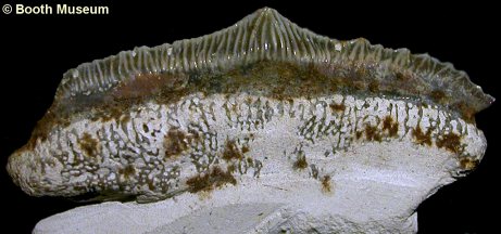 1). Polyacrodus illingworthi - Lingual view of a tooth, from a small association of teeth which comprise the type material (x4, Grey Chalk, Southerham, near Lewes, Sussex, Willett Collection, Booth Museum, BMB 007357, by kind permission of John Cooper).