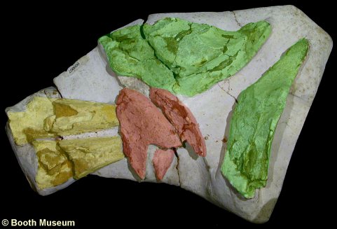 3). A complete set of Chimaera demtal plates from the Chalk (A) and a the jaws of a recent Chimaera (B), with dental plates coloured to demonstrate how the fossil remains fit into the anatomy of the jaws (green - mandibular dental plates; red - vomerine dental plates; yellow - palatine dental plates). (A) Edaphodon sedgwicki x0.55, Lewes, East Sussex, Booth Museum, BMB 009007, by kind permission of John Cooper. (B) Recent Chimaera, x4, from the collections of the Grant Museum, image used by kind permission.