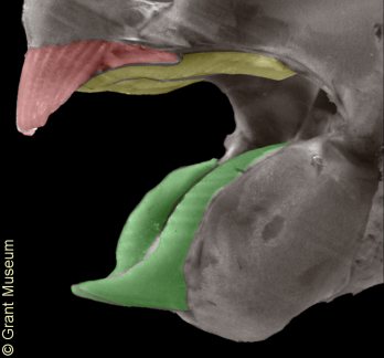 2). Cartilaginous skull of a recent Chimaera: (A) Overview of left side of skull (x1.5); (B) Detail of mouth indicating the arrangement of dental plates which comprise the beak-like jaws. The lower jaw contains a single pair of mandibular dental plates. The upper jaws have a pair of vomerine dental plates at the front, and a pair of palatine dental plates behind (x4). From the collections of the Grant Museum, images used by kind permission.