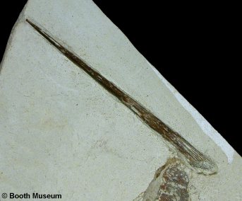 6). Dorsal fin spines: (A) Recent Chimaera displaying prominent fin spine associated with the dorsal fin and (B) fossil dorsal fin spine of Elasmodectes sp. from the Chalk. (A) Modified from image posted by Washington University News.; (B) x2.0, Grey Chalk, West Melbury Marly Chalk, Clayton, near Brighton, West Sussex, Willett Collection, Booth Museum, BMB 007269, by kind permission of John Cooper.