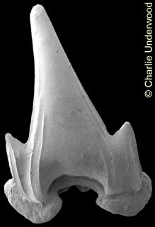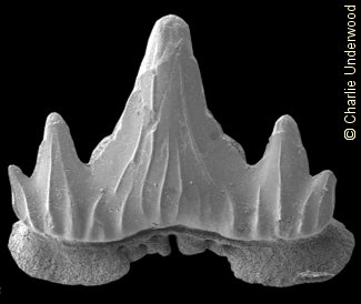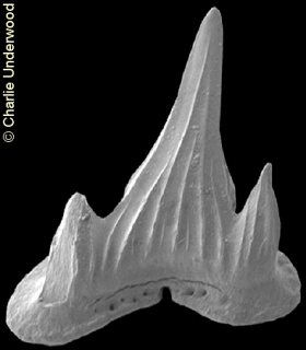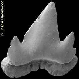 3). Scyliorhinus elongatus - labial views of isolated teeth from the Upper Santonian (Newhaven Chalk, Marsupites testudinarius zone) phosphatic chalk of Winterbourne, Berkshire: ((A) anterior tooth, x35; (B) lateral tooth, x50). Images figured in Underwood & Ward, 2008, and used here by kind permission of Charlie Underwood.