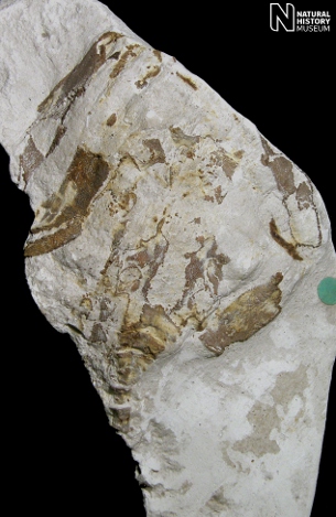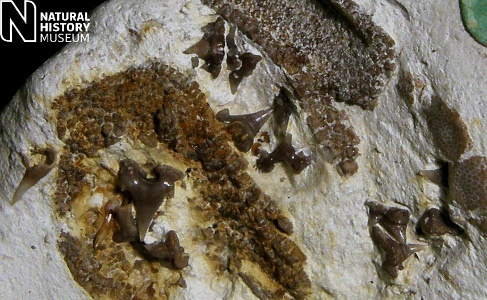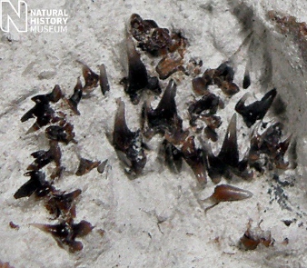 2). Scyliorhinus dubium - Detail of the holotype specimen displaying teeth (labial surfaces) preserved in life arrangement. Note the tooth top left showing a basal profile of the root. (x17, Grey Chalk, Kent, NHMUK (British Museum (Natural History) London) PV P47288). Image © 2012 The Natural History Museum, by kind permission.