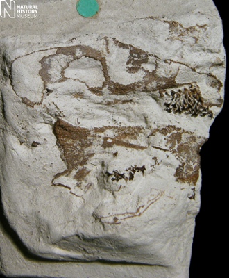 4). Scyliorhinus dubium - (A) part and (B) counterpart pieces of the holotype specimen, displaying remarkable preservation of the cartilaginous jaw parts, and with teeth preserved in or close to life arrangement (x2.6, Grey Chalk, Kent, NHMUK (British Museum (Natural History) London) PV P47288). Images © 2012 The Natural History Museum, by kind permission.