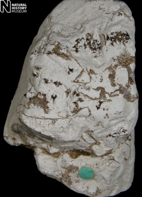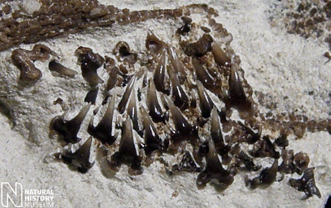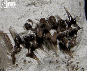 7). Scyliorhinus antiquus - Detail of the anterior portion of the jaws with associated teeth, labial and lingual surfaces displayed (x7, Grey Chalk, Burham, Kent, NHMUK (British Museum (Natural History) London) PV P5889). Image © 2012 The Natural History Museum, by kind permission.