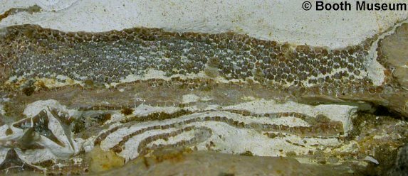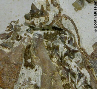 8). Squatina cranei; detail of the type specimen figured above (Figure 2) showing dermal denticles resting against a calcified formerly cartilaginous skeletal element from the back of the head (x9).