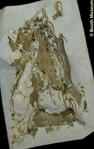 3). Squatina cranei - (A) Part and (B) counterpart of the exceptionally preserved type specimen figured above, which displays robust calcification of the originally cartilaginous skeletal elements of the head. The front of the animal is towards the top of the image in both views; (A) Dorsal view of the head and anterior portion of the trunk, including a possible remnant of the right pectoral fin (bottom right of the image)(x1.2); (B) Ventral (underside) view of the head (mandibular and hyoid arches), displaying the undersurface of the lower jaws (Meckel's cartilage) in life position, framed within the upper jaws (palatpquadrate), both retaining their complement of teeth (x1.7).