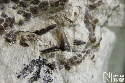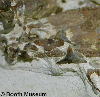 Angel Sharks possess a flattened ray-like body plan, and a large number of small but distinctive clutching / grasping teeth. These are low and wide, with a simple, central triangular main cusp and a low root with a broad, flattened base. There are no accessory cusps, instead there are long, low areas of crown either side of the main cusp. A pendant-like extension of the crown hangs down over the labial face of the root directly below the main cusp. Anterior-most teeth are of conservative form, comprising a simple, narrow and distally-curved main cusp, taller than wide. A single exceptionally preserved individual is recorded (figured below). Isolated teeth are not abundant in the field.