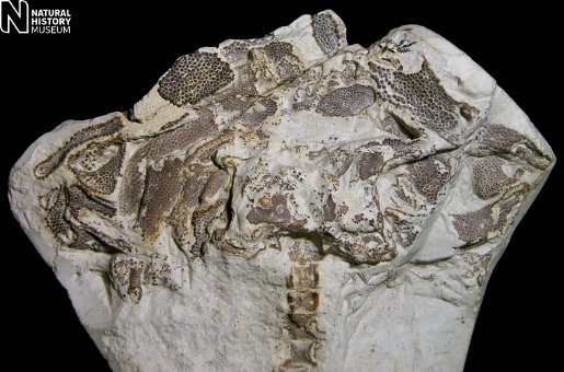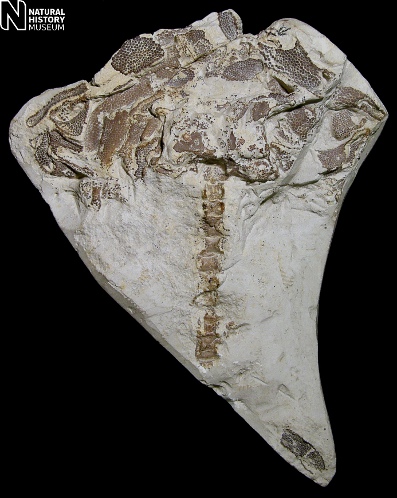 4). Squatina cranei - Overview of remarkably preserved specimen, with an articulated vertebral column (evidently complete at least as far as the pectoral arch as preserved) and near complete complement of cartilaginous elements of the head. A small number of associated teeth are also seen (x1.2, Grey Chalk, Halling, Kent, NHMUK (British Museum (Natural History) London) PV P12213). Image © 2012 The Natural History Museum, by kind permission.