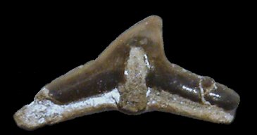 1). Squatina sp. - (A) Labial view of an isolated latero-posterior tooth, with a prominent medial 'rod' of enamaloid bridging the root and the base of the main cusp (x12, Seaford Chalk, St Margarets, Kent, Randell Collection RR1389).