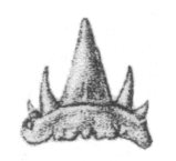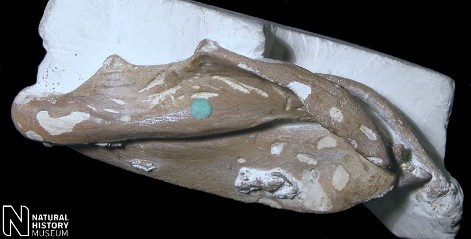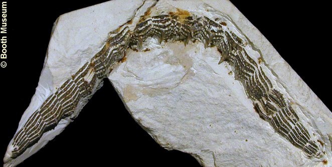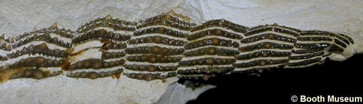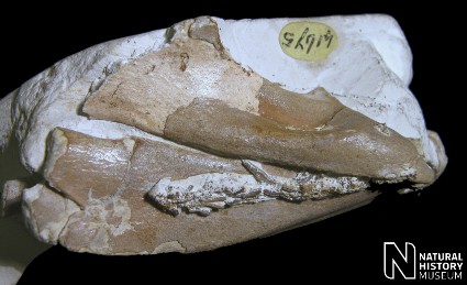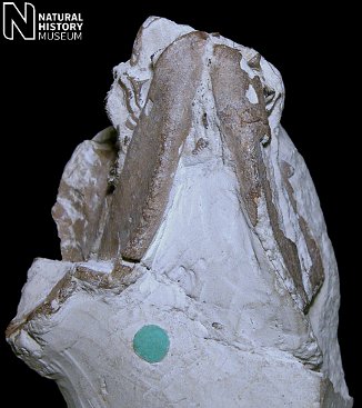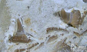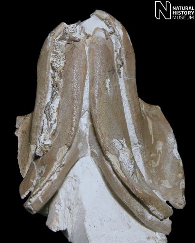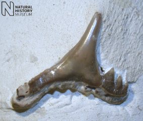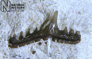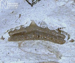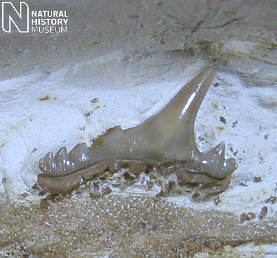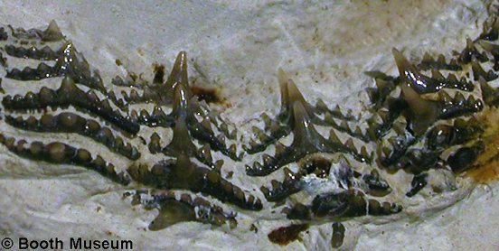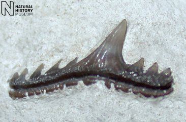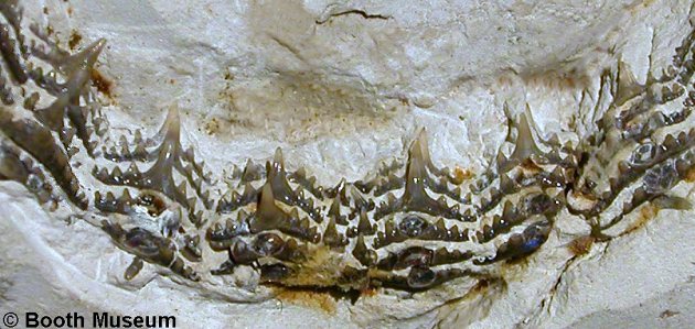 2). Synechodus dubrisiensis; a unique specimen of a single jaw, lacking the cartilaginous jaw parts, but preserving the complete dentition in perfect articulation (x2.7, Grey Chalk, Sussex, Willett Collection, Booth Museum, BMB 008523, by kind permission of John Cooper).