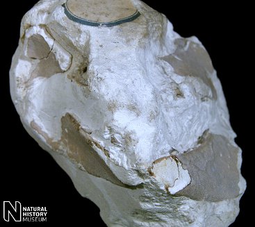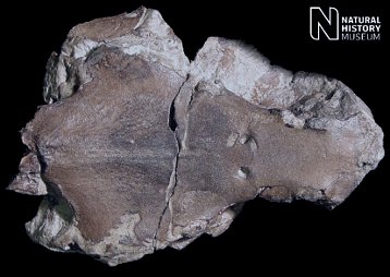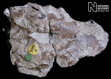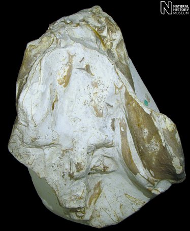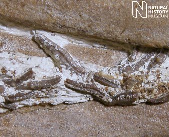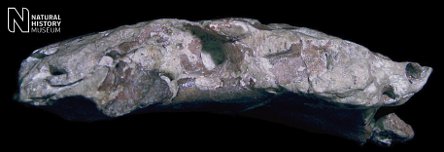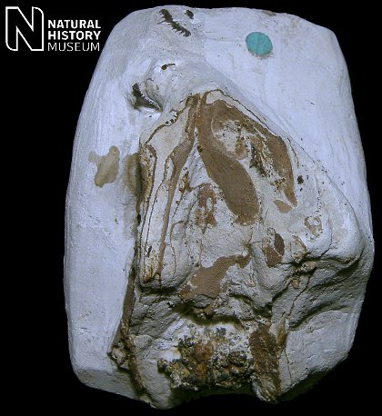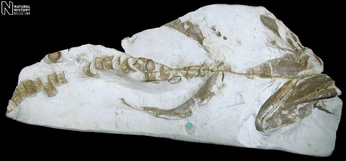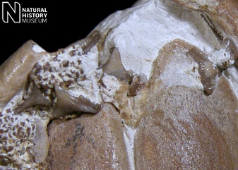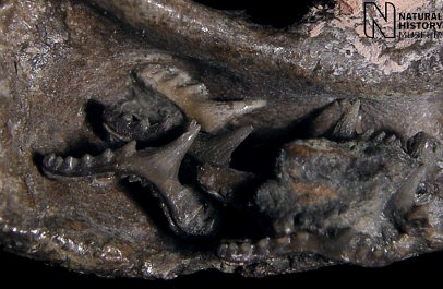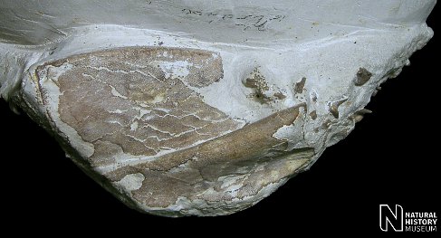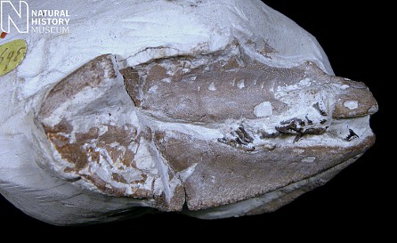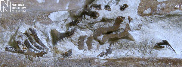 8). Synechodus dubrisiensis - Ventral (underside) view of a partial anterior portion of an exceptionally preserved specimen (front of animal to the right) displaying jaws (mandibular arch), hyoid arch, chondrocranium, vertebrae and pectoral arch (x1.0, Zig Zag Chalk, Burham, Kent, NHMUK (British Museum (Natural History) London) PV P49032. Image © 2011 The Natural History Museum, by kind permission.