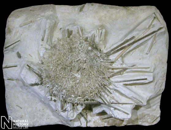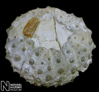 1). Adoral view of an exceptionally preserved individual, retaining a largely complete compliment of articulated spines (x1.2, Grey Chalk, Folkestone, Kent, BMNH (British Museum (Natural History) London) E1084. Image © 2007 The Natural History Museum, by kind permission.