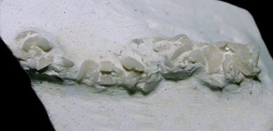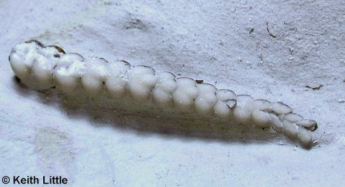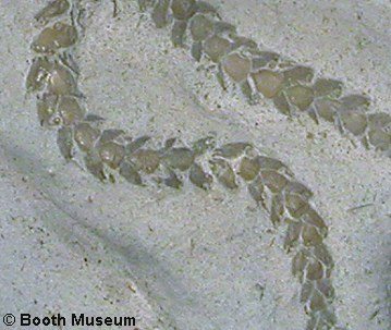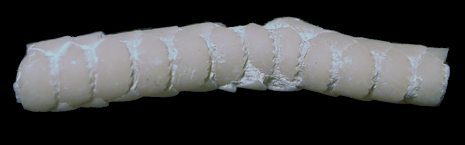 10). Ophiomusium cf. granulosus, isolated arm. Note the beaded form of the proximal arm and the imbricated plate-like form of the distal arm (x5.5, White Chalk, Plenus Marls, south of Dover, Kent, in the collection of Keith Little). Image © 2011 Keith Little, by kind permission.