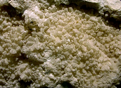 5). Calcite crystals, x2.0, Grey Chalk, Cow Gap, near Eastbourne. Voids within the Chalk, such as fractures or with brachiopod and echinoid shells, are often the site of secondary mineral growth. Typically this takes the form of euhedral calcite crystals. Larger voids and minor cave networks may develop speleothem structures such as stalactites.