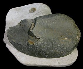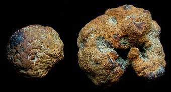 4). Iron sulfide nodules (Marcasite / Pyrite) are frequently encountered in the Chalk, particularly the Grey Chalk, and are often found in association with fossil material. Exceptionally preserved specimens from the Grey Chalk, particularly fish and starfish, are often partly overgrown by nodules. (A) Nodule in situ in an exposure of Grey Chalk; (B) typical nodules; (C) a freshly spilt nodule displaying the striking gold colouration which explains the common name of 'Fool's Gold'. All x1.0, Grey Chalk, Abinger Hammer, near Guilford.